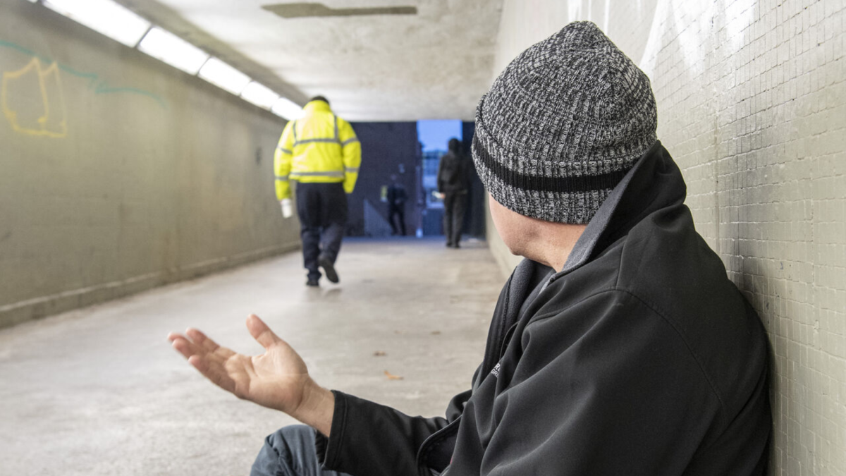 Image with headline: A man wearing dark clothing and a grey winter hat is sat on the floor of an underpass in Sheffield city centre. His hand is outstretched and his face is turned away from the camera. He is looking at the commuters who have passed him by, as they continue on their journey to work.